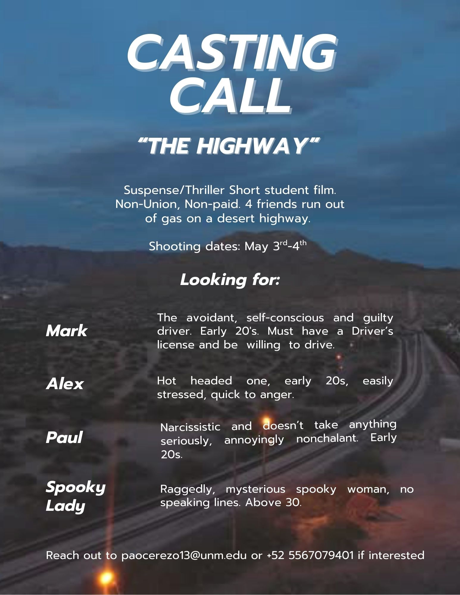 Hi, my name is Paola Cerezo and I am the casting director of “The Highway” , a non-union non-paid student short film directed by James Harrison. We’re looking for actors to complete the cast. Filming will be approximately 40 minutes away from main campus and we’re set to film on the weekend of May 3rd and 4th. Please send me an email if interested at paocerezo13@unm.edu or text me +52 5567079401